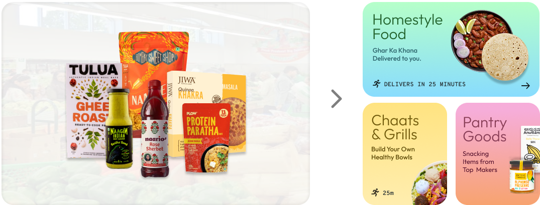 Food products are reorganized into a simplified, emotionally intelligent UX that prioritizes cultural context over traditional grocery structures. Instead of overwhelming users with endless SKUs and generic sections, the interface presents curated, intention-driven collections: “Homestyle Foods” or “Chaats & Grills” – this reduces decision fatigue while aligning with how modern consumers shop: based on emotion, identity, and occasion.