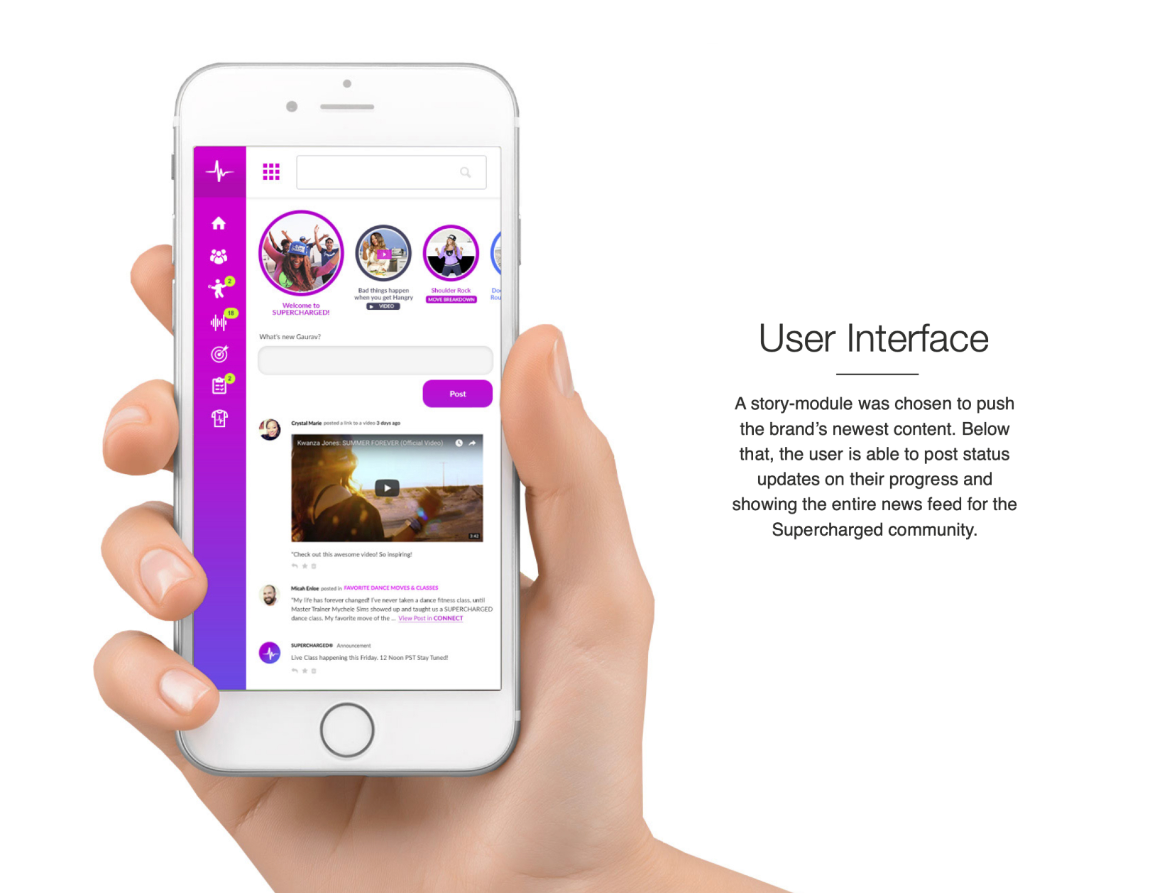 A story-module was chosen to push the brand’s newest content. The user is also able to post status updates on their progress and showing the entire news feed for the community.