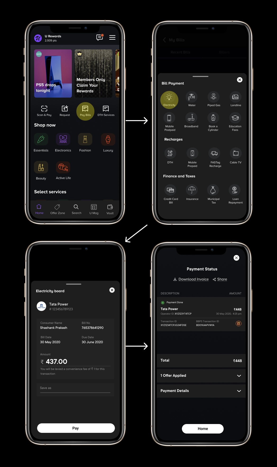 Let’s take for example a simple task like Bill Payment. Normally these are fulfilled by the company’s own web platform or a brick-and-mortar store location, but all have varying levels of support & reliability. If your electric company’s website is down, you’ll have to physically go get to the local agent before your electricity is shut off for missing payment. This obviously becomes very tedious, here’s a flow in Tata Neu which solves that problem: